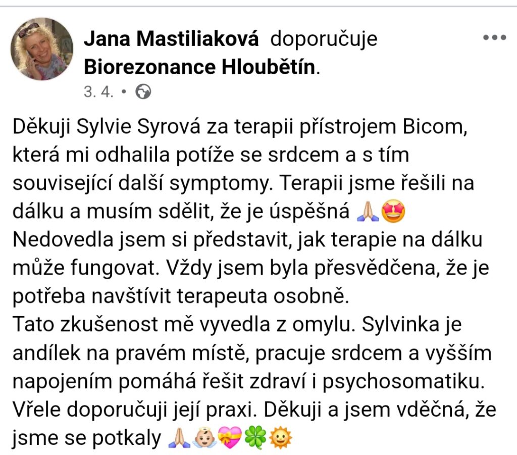 U paní Sylvy na bicomu jsem byla už několikrát. Ze zkušenosti vím, že přístroj funguje spolehlivě na fyzické úrovni, tj. harmonizuje orgány, odstraňuje z těla těžké kovy atd., což se dá snadno ověřit. K mému údivu jsem ale zjistila, že se dá úspěšně použít i v oblasti vztahů prostřednictvím narovnání energií mezi lidmi. Mně se po terapiích zlepšil vztah se dvěma členy mé rodiny. Přišlo mi to neuvěřitelné a jako věčný skeptik jsem si říkala, že je to asi jen náhoda. Prostě se jen přestaly dít situace, ve kterých docházelo ke sporům a nepochopení, říkala jsem si. Při terapiích se mi také nic zvláštního nestalo, prostě jen v klidu proběhly. Ovšem to, co se stalo při terapii s mojí mamkou, která je už řadu let mrtvá, mě přesvědčilo, že přístroj ví, co dělá a prostě to umí. Paní Sylva navrhla zařadit do léčby mého problému i vyrovnání energií s mojí maminkou, jejíž smrt mě velmi zasáhla. V tuto chvíli jsem si ale říkala, že už je to zbytečné, že jsem se s tím dávno vyrovnala, je to už dlouhá řada let, a navíc řešit energie s mrtvým člověkem? Jen jsem tedy tak ležela a relaxovala, vůbec nic jsem neočekávala, když jsem najednou pocítila velké stažení a tlak na hrudi a usilovně jsem se rozplakala. Slzy mi tekly proudem a celá jsem se chvěla. To trvalo až do konce terapie. Vůbec jsem to nechápala. Něco takového si doteď nedokážu vysvětlit, ale evidentně to funguje. Vím, že teprve nyní, můžu tuto pro mě hodně bolestnou záležitost považovat v sobě za uzavřenou.