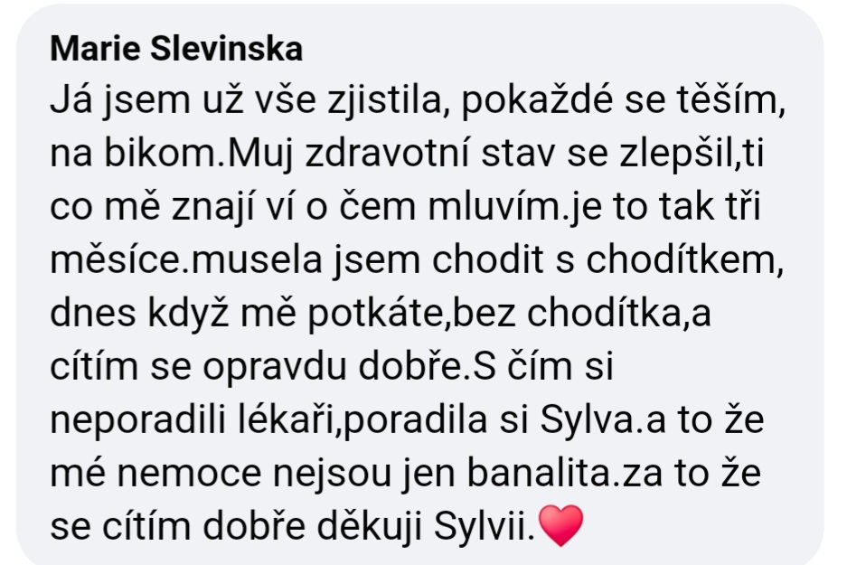 S terapií Bicom a přístupem Sylvie jsem velmi spokojená a musím říct, že to předčilo mé očekávání. Biorezonance mi nyní intenzivně pomáhá nejen odhalovat a řešit zdravotní problémy a hlavně jejich příčiny, ale také narovnávat moje (naše) vztahy. Vztahy považuji ve svém životě za to nejdůležitější, a to hlavně v rodině. Vztahy obecně chci mít urovnané, lépe se mi funguje, dýchá a také spí.